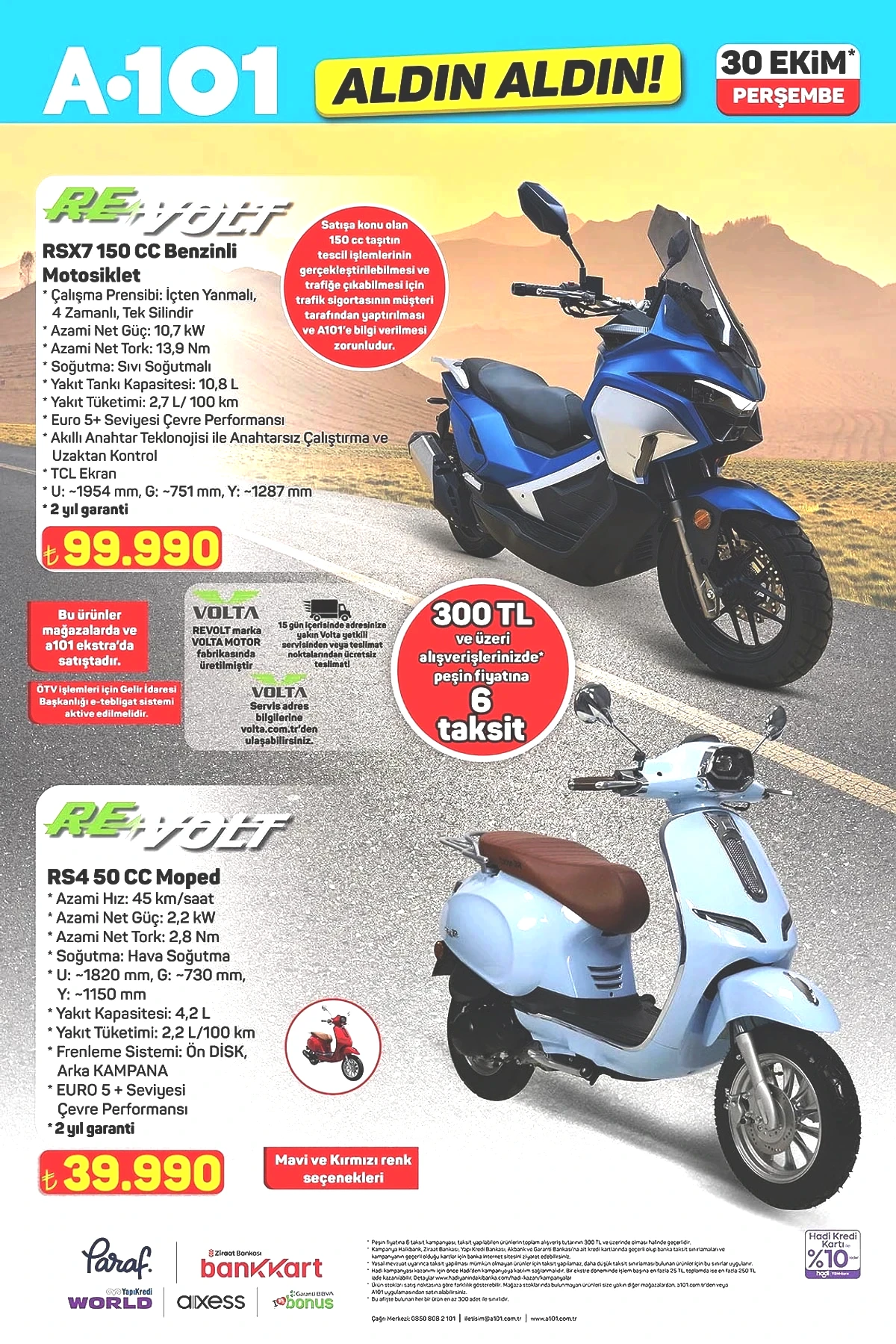 A101, 30 Ekim 2025 tarihi ile yeni "Aldın Aldın" kataloğunu tanıttı. Bu haftanın öne çıkan ürünü ReVolt RSX7 150 CC benzinli motosiklet. Ayrıca televizyon, küçük ev eşyaları, mutfak malzemeleri ve mobilyalarda dikkat çekici indirim fırsatları mevcut.
